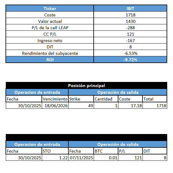 El subyacente que he elegido ha sido el ETF IBIT. Es un ETF vinculado al Bitcoin. Lo vemos todo en la imagen de abajo: