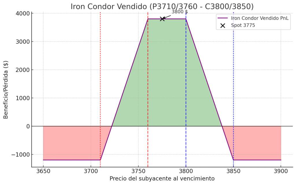 Por tanto, he reconvertido una posición neutral-bajista 1-1-1-1 en una posición neutral (iron condor). Si el oro se encuentra entre 3760 y 3800 de aquí a vencimiento, nos llevaremos todo el crédito, unos 3800$. El riesgo máximo de la posición es la diferencia entre los strikes + 3800$, es decir, 1200$. El gráfico es el siguiente: