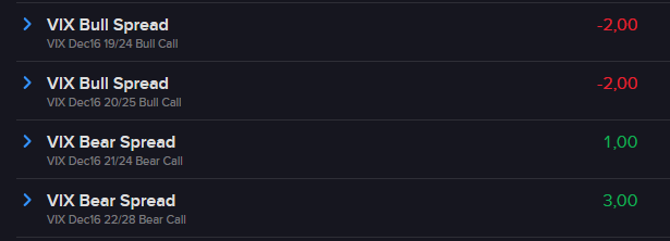 callspreads bajistas en VIX: Dados los picos de VIX que vimos hace unos días, he introducido estrategias orientandome a la estabilización de la volatilidad antes del 16 de diciembre. (No sé porqué algunos «volumenes» están en rojo y otras en verde)